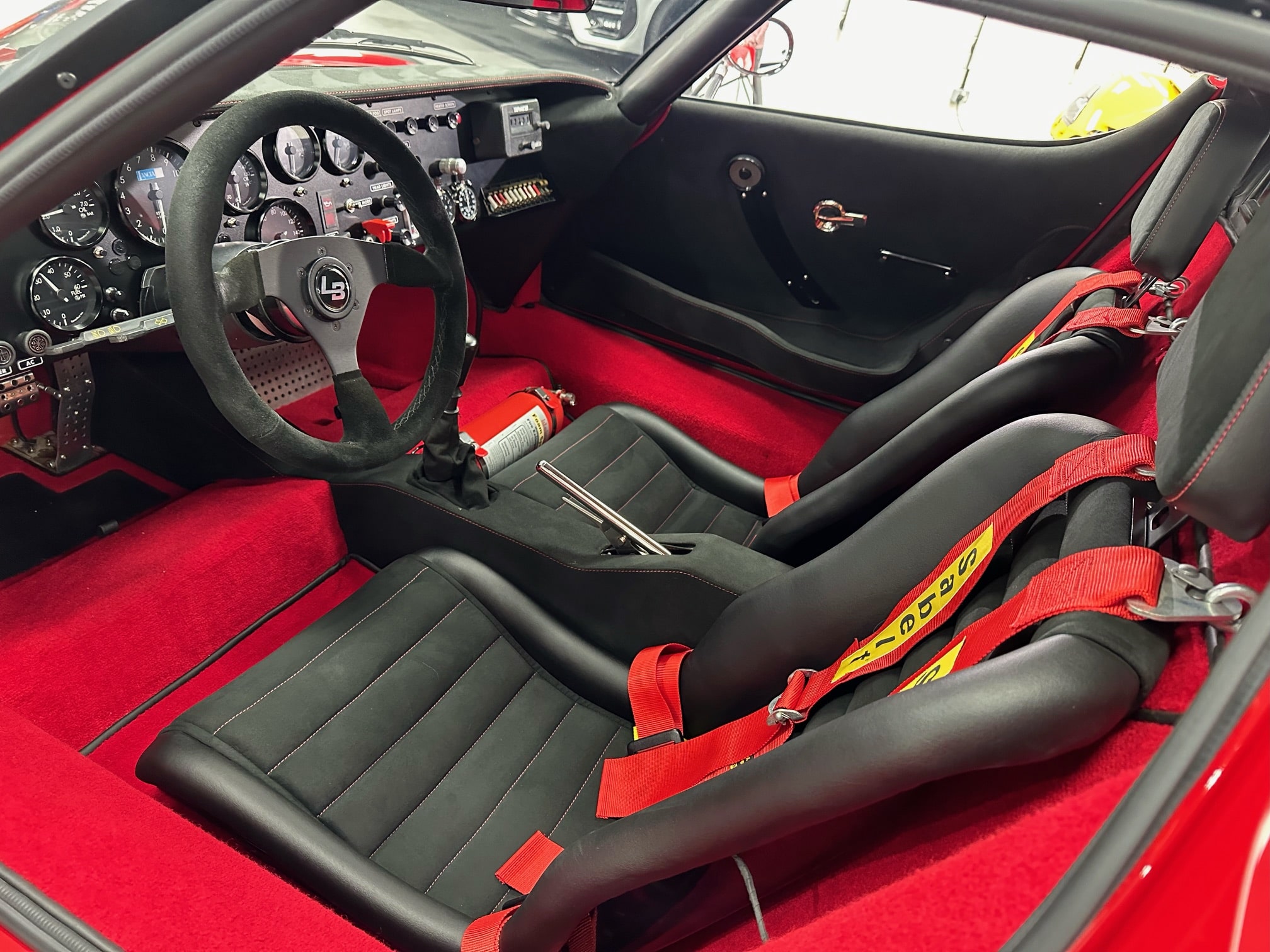 The car is built in LHD format and has the full Gp4 body package including the square arch rear body section, spoilers, roof scoop & the full complement of exterior lights. In the interior we have a full Gp4 replica dash board complete with Halda trip & Monte Carlo type stopwatches, etc. The seats are our own latest LB Gp4 replica style, which maximise the interior space available and the occupants are held in place using Sabelt 4 point FIA harnesses. The steering wheel is also removable for ease of ingress & egress.